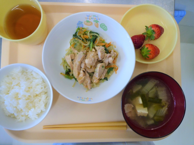 昼食:ご飯、棒棒鶏、中華スープ(豆腐、にら、白菜、ベーコン)、いちご