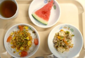 昼食:タコライス、ゴーヤーチャンプルー、すいか、麦茶