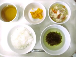 離乳食(中期)午前食:おかゆ、肉団子のトマト煮、人参のおひたし、スープ