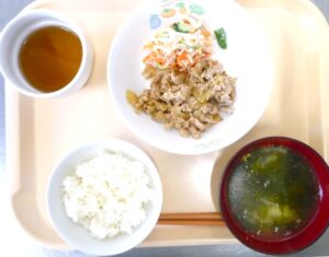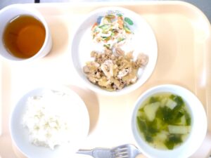 昼食:ごはん、焼肉、切干大根のツナサラダ、わかめスープ、麦茶