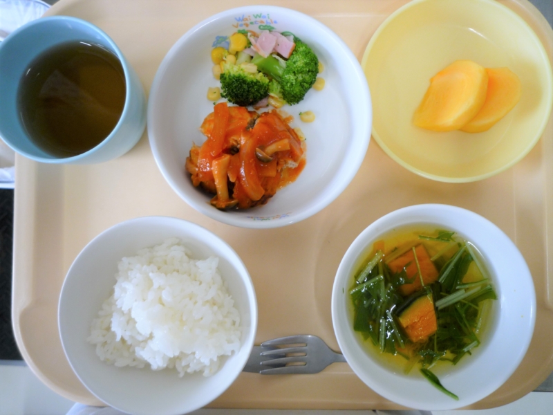 昼食:ご飯、煮込みハンバーグ、ブロッコリーソテー、かぼちゃのスープ