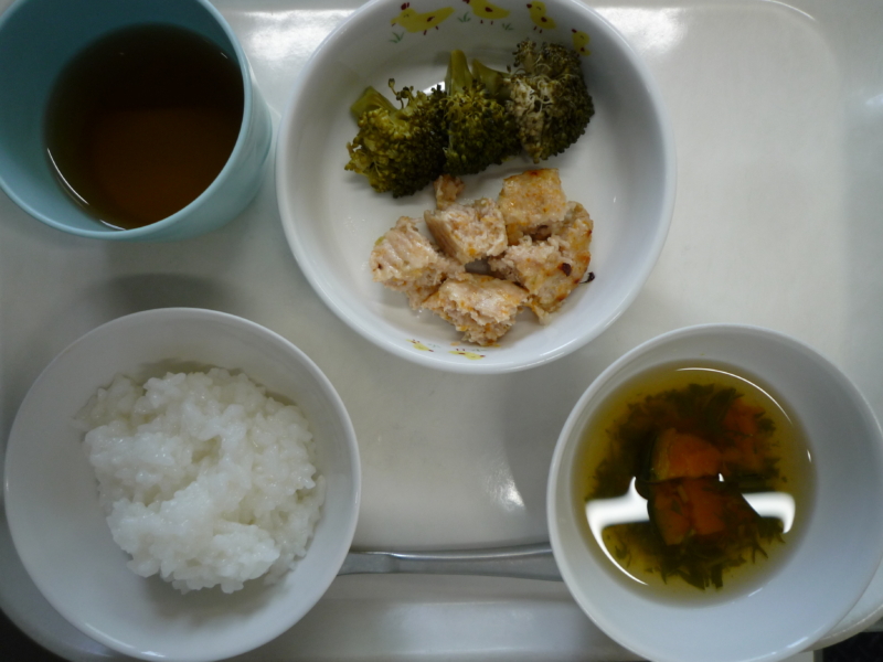 離乳食(後期)昼食:全粥、ハンバーグ、ブロッコリー、かぼちゃスープ、麦茶