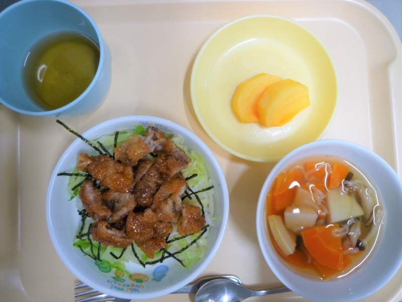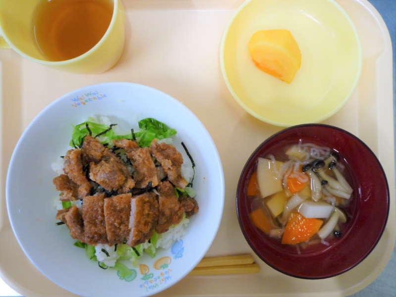 昼食:ソースかつ丼、こづゆ(人参、里芋、しらたき、しめじ、貝柱水煮缶)、柿