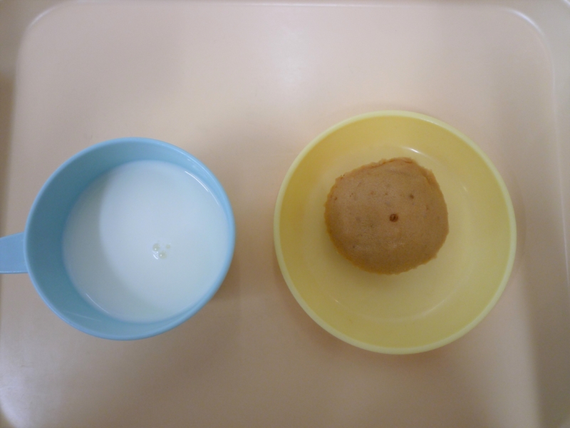 午後おやつ:黒糖まんじゅう、牛乳