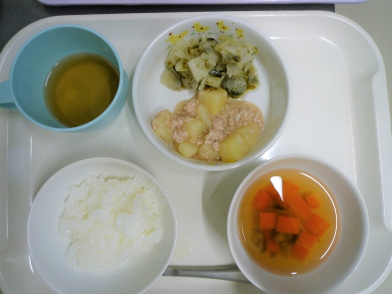 離乳食(後期)昼食:全粥、じゃが芋のそぼろ煮、磯香和え、すまし汁