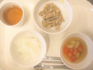 離乳食(後期)昼食:おかゆ、キャベツのそぼろ煮、すまし汁