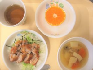 昼食:ソースカツ丼、こづゆ(人参、里芋、しらたき、たけのこ、ホタテ貝柱、しめじ)、みかん、麦茶