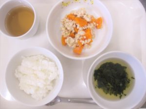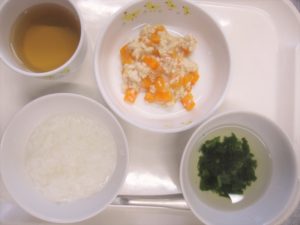 離乳食(後期)昼食:おかゆ又は軟飯、にんじんのそぼろ煮、すまし汁