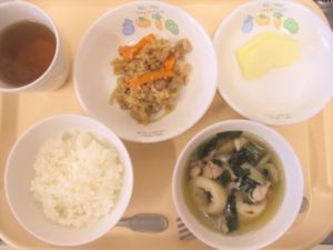 昼食:ごはん、きりたんぽ鍋、切干大根煮、りんご