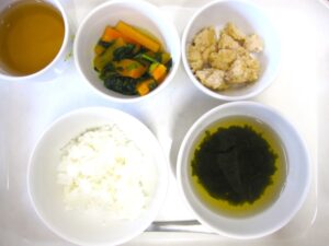 離乳食(後期)昼食:軟飯、鶏つくね煮、おひたし、すまし汁