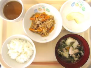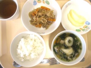 昼食:ご飯、きりたんぽ鍋、切り干し大根の煮物、りんご、麦茶