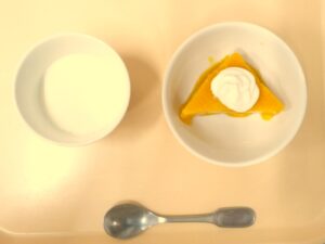 午後おやつ:かぼちゃプリン、牛乳