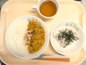 秋野菜カレーにはれんこん、ごぼう、なすなどをたっぷりと使用し、野菜の旨味を活かして味わい深いカレーになりました。みんなが大好きなカレーも具材を変えて飽きないおいしさを工夫しています。