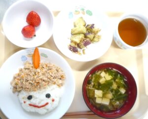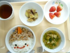 昼食:鬼そぼろ丼、さつまいものじゃこ和え、すまし汁、いちご、麦茶