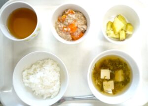離乳食(後期)昼食:おかゆまたは軟飯、にんじんのそぼろ煮、ベイクドポテト、すまし汁