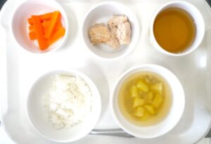 離乳食(中期)午前食:おかゆ、煮込みハンバーグ、人参のおひたし、すまし汁