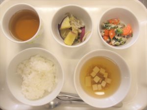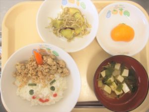 昼食:鬼そぼろご飯、さつまいものじゃこ和え、すまし汁(豆腐、水菜、えのき)、みかん、麦茶