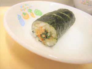 離乳食(後期)昼食:軟飯、人参のそぼろ煮、さつまいものじゃこ和え、すまし汁