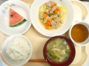 昼食:ごはん、肉じゃが、みそ汁(高野豆腐、にら、キャベツ )、すいか、麦茶