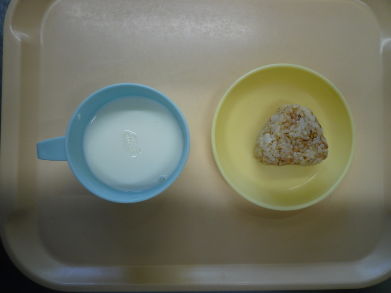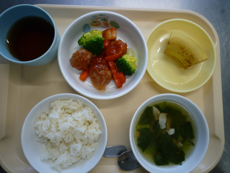 昼食:ご飯、肉団子の甘酢あんかけ、青菜とコーンのスープ(小松菜、コーン、ベーコン)、バナナ、