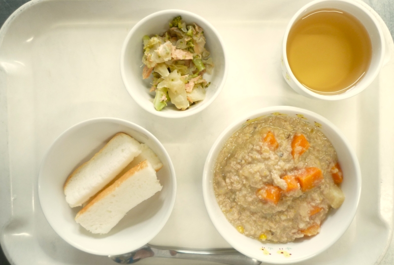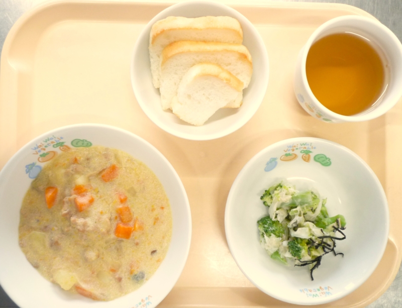 昼食:米粉パン、豆乳クリームシチュー、ブロッコリーとツナサラダ