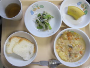 昼食:米粉パン、豆乳クリームシチュー、ちりめんサラダ、バナナ、麦茶