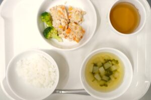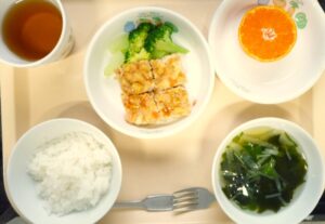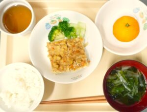 昼食:ごはん、豆腐とひき肉の中華蒸し、大根スープ、みかん