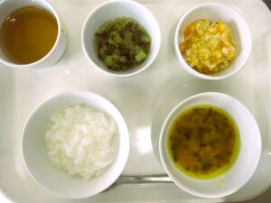 離乳食(中期)午前食:おかゆ、肉団子煮、スティックきゅうり、スープ