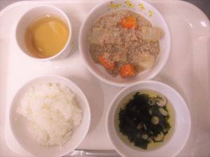 昼食:ご飯、豚だいこん(豚肉、大根、人参、こんにゃく)、すまし汁(わかめ、三つ葉、しめじ)、バナナ、麦茶