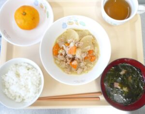 昼食:ごはん、豚だいこん、和風スープ、みかん、麦茶