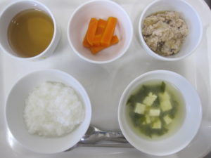 離乳食(後期)昼食:おかゆ又は軟飯、肉団子煮、人参煮、みそ汁