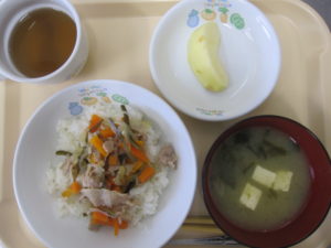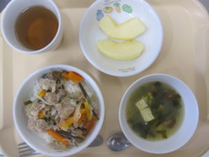 昼食:豚丼、みそ汁(わかめ、なめこ、豆腐)、りんご、麦茶