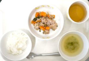 離乳食(後期)昼食:軟飯、豚つくねと野菜のごま煮、みそ汁(長ねぎ、わかめ)