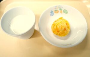 午後おやつ:アップルキャロット蒸しパン、牛乳