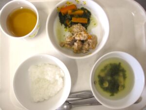 離乳食(後期)昼食:おかゆ、肉団子煮、おひたし、すまし汁