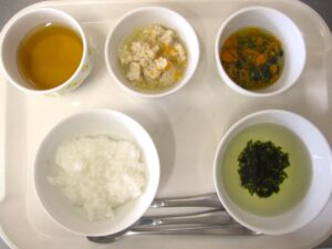 離乳食(中期)午前食:おかゆ、肉団子煮、おひたし、すまし汁