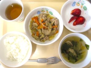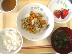 昼食:ご飯、豚肉とごぼうのごままぶし、すまし汁(小松菜、しめじ、たまねぎ)、いちご、麦茶