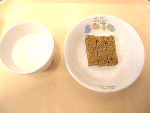 午後おやつ:ごまパンケーキ、牛乳