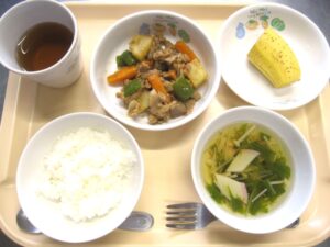 昼食:ご飯、豚肉とじゃがいもの味噌煮、すまし汁(水菜、えのき、かまぼこ)、バナナ、麦茶