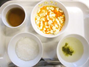 離乳食(中期)午前食:おかゆ、豆腐と野菜のうま煮、スープ