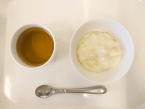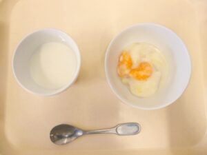 離乳食(後期)午後おやつ:バナナクリームあえ、麦茶