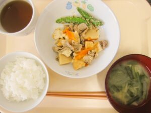 昼食:ご飯、豚肉とたけのこの炒め煮、スナップえんどうのごままぶし、みそ汁(玉ねぎ、にら、えのき)、りんご(乳児のみ)、麦茶