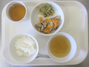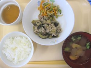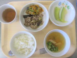 昼食:ごはん、豚肉となすの味噌炒め、人参のじゃこ和え、すまし汁(冬瓜、かまぼこ、おくら)、メロン(乳児のみ)、麦茶