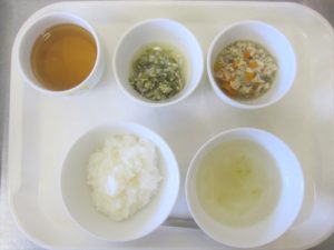 離乳食(中期)午前食:おかゆ、なすのそぼろ煮、おくらのじゃこ和え、スープ