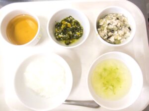離乳食(中期)午前食:おかゆ、なすのそぼろ炒め煮、しらす和え、すまし汁