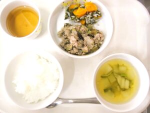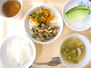 昼食:ごはん、豚肉となすの味噌炒め、にんじんのじゃこ和え、すまし汁(とうがん、かまぼこ、オクラ)、メロン(乳児のみ)、麦茶