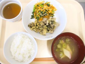 離乳食(後期)昼食:軟飯またはおかゆ、なすのそぼろ炒め煮、しらす和え、すまし汁、麦茶