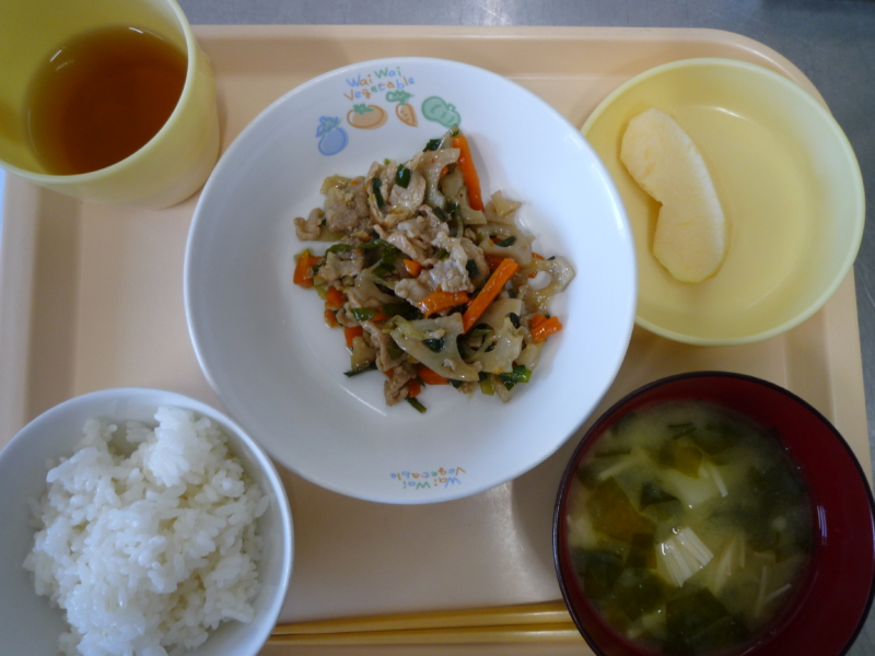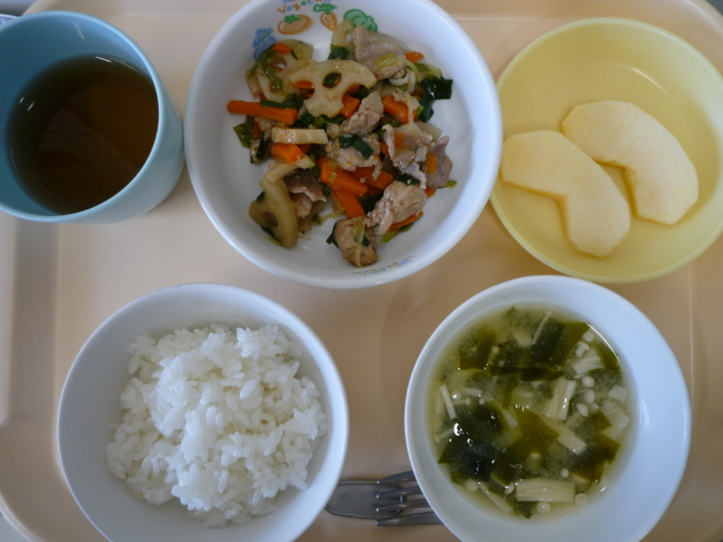 昼食:ご飯、豚肉とれんこんの炒め、みそ汁(じゃがいも、わかめ、えのき)、りんご、麦茶