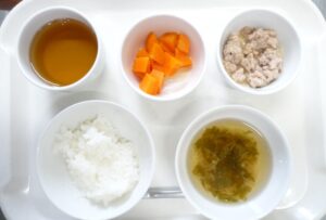 離乳食後期の昼食:軟飯、肉団子煮、にんじん煮、すまし汁(みずな、えのき)麦茶