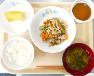 昼食:豚肉とれんこん炒め、すまし汁、バナナ、麦茶
